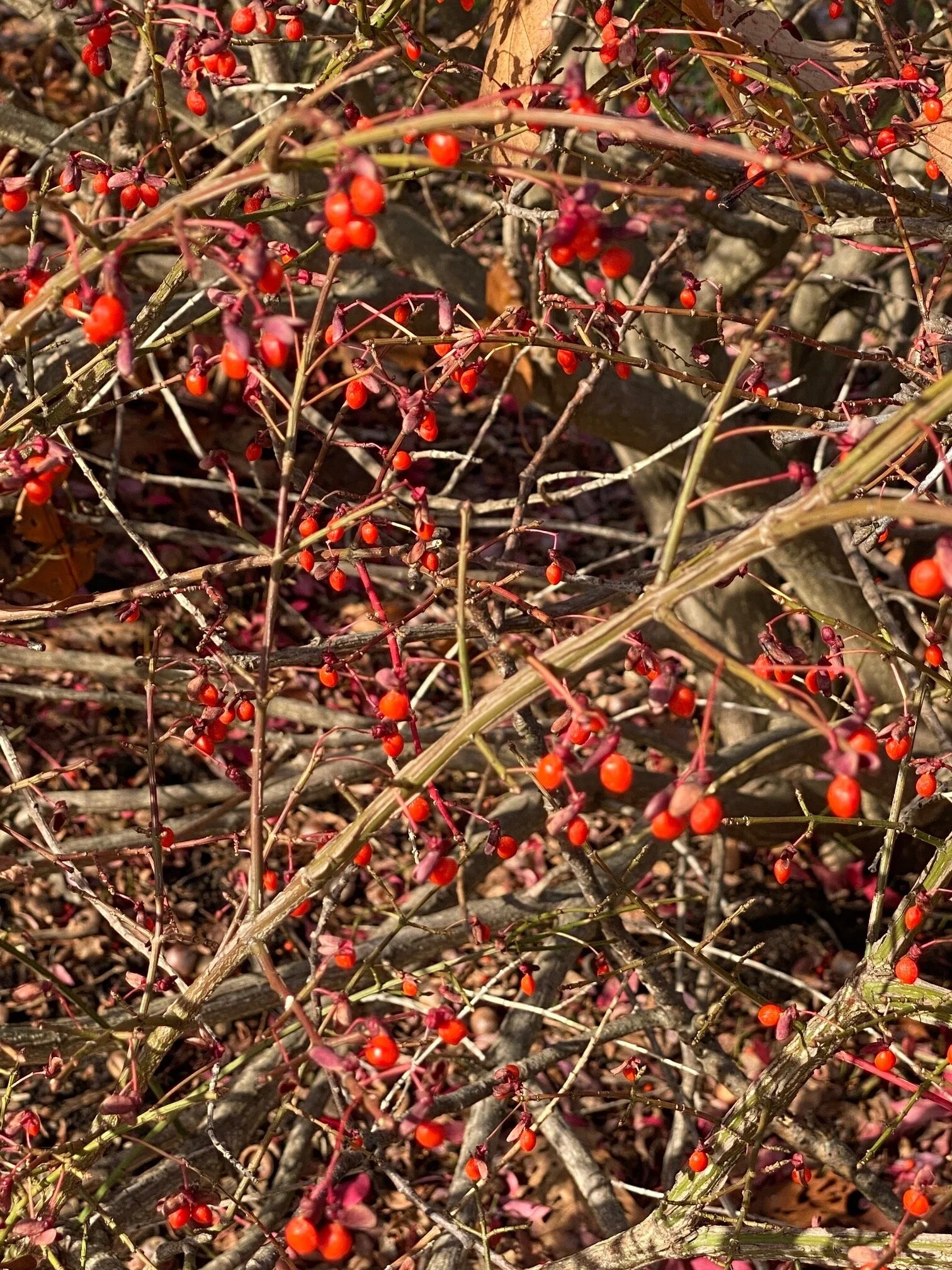 Many shrubs that were once popular ornamentals are now among the most invasive plants. We saw lots of common privet, Ligustrum sinense, on our walk in Little Crum Creek Park. Many viburnums that were once coveted both for their ornamental fruits and flowers, like Siebold’s viburnum, Viburnum sieboldii; Linden viburnum, Viburnum dilatatum; and one of my favorites, the double-file viburnum, Viburnum plicatum f. tomentosum, are now considered highly invasive. Several honeysuckles, including Lonicera maackii and four other species, are also problems. The entire understory of some Connecticut forests is covered with the Japanese barberry, Berberis thunbergii. Burning bush, Euonymus alatus, once coveted for its fire-engine fall color, is also highly invasive.