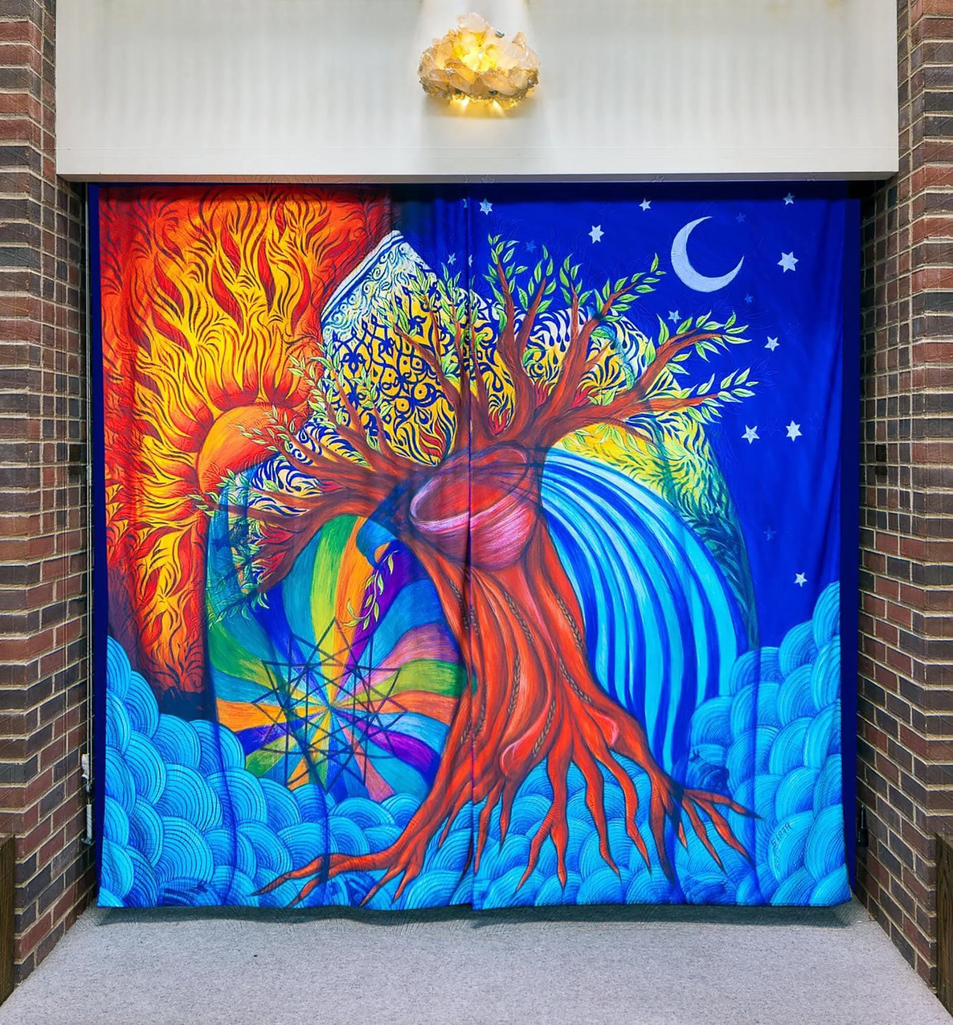 Ohev Shalom’s new curtain is anything but plain. A vibrant red tree spreads its branches across a background of rich blues. An orange and yellow sun blazes in one corner, a silvery moon and stars in another. “You see different colors swirling,” says Jeremy Gerber, the congregation’s rabbi. He points out a coat “right by where the sun is. You can see the collar, the shoulder.”