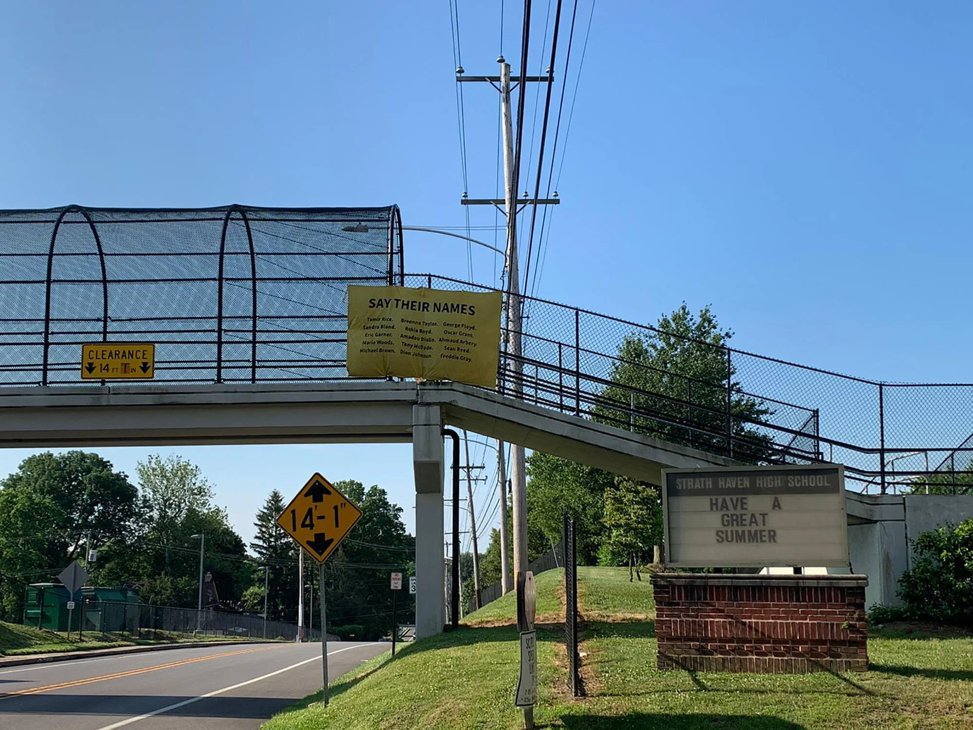 The banner was held over the highway for eight minutes and 46 seconds, the same amount of time that a police officer in Minneapolis strangled George Floyd to death with his knee. The banner was then transported to the bridge connecting Strath Haven Middle School and High School over Providence Road. It was taken down less than a week later by an unknown entity.